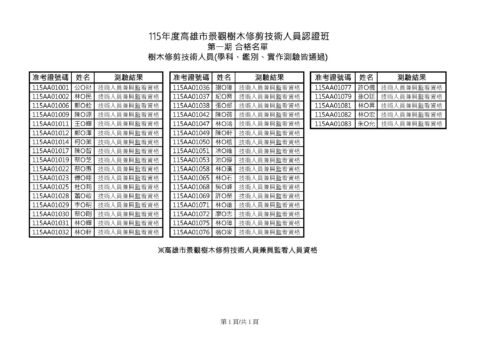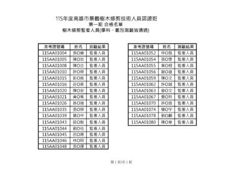 115年度高雄市景觀樹木修剪技術人員認證班第一期 成績公告及查詢
