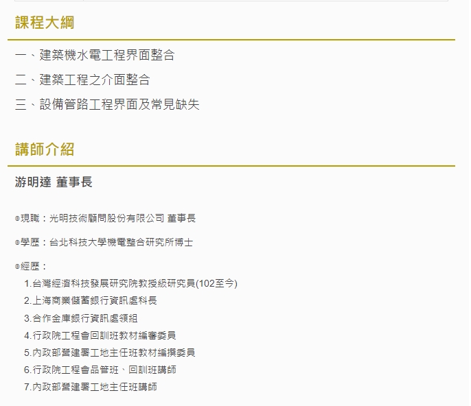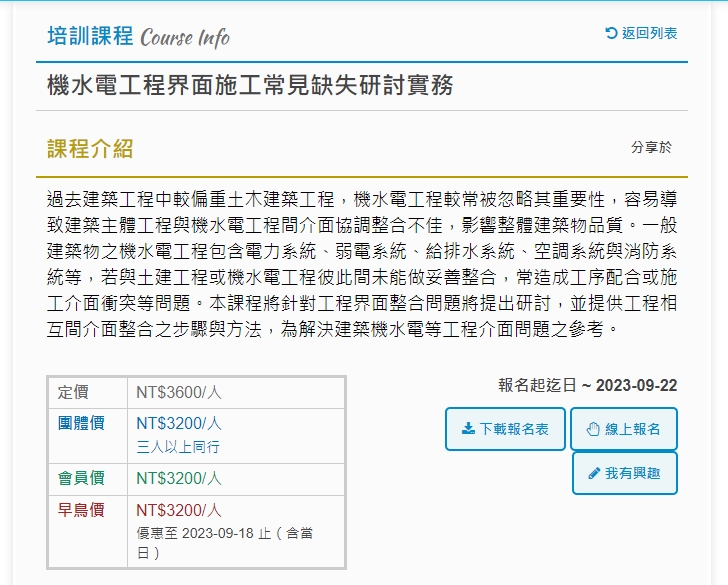 開辦「機電工程系列-機水電工程界面施工常見缺失研討實務」課程,
